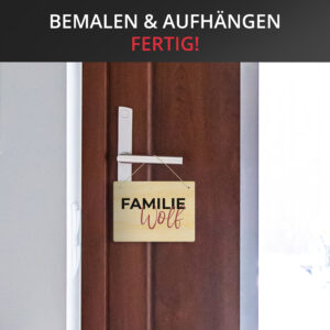 Nachdem Sie das Türschild gestaltet haben verwenden Sie bitte eine Versiegelung um das Holz vor Feuchtigkeit und Witterung zu schützen. Eine Versiegelung verbessert auch die Farbe und verhindert ein Ausbleichen. Lassen Sie die Versiegelung trocknen bevor Sie die Türschilder aufhängen.