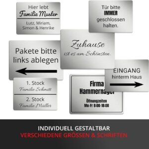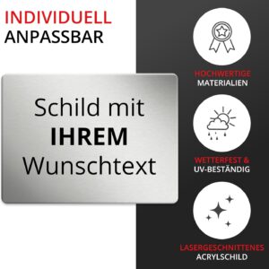 Dank des robusten, 1,6 mm dicken Acryls in stilvoller silber-schwarzer Edelstahloptik sind unsere Schilder ideal für den Außenbereich. Sie sind UV-beständig, wetterfest und halten Sonne, Regen und Wind problemlos stand, ohne an Qualität zu verlieren.